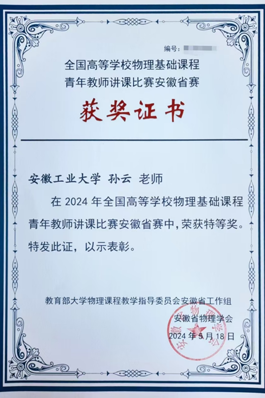 5月16至18日,2024年全国高等公司物理基础课程青年教师实验教学讲课比赛省赛在安庆师范大学举行。经过激烈的角逐,太阳成tyc33455ccwww教师孙云凭借出色的表现获特等奖(第一名),并被推荐参加华东赛区复赛。