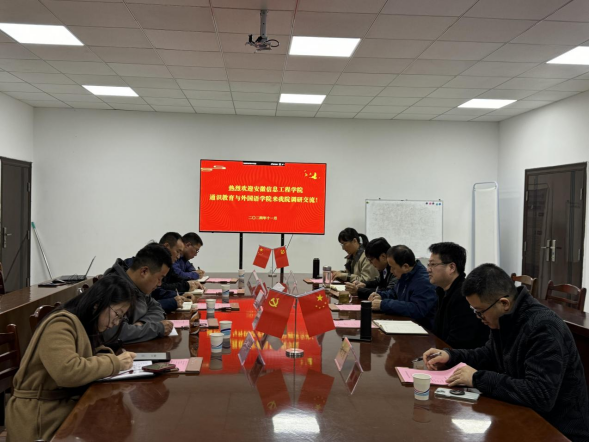 11月19日下午,安徽信息工程公司通识教育与外国语公司党总支书记孙立、主持工作副经理罗从文以及副经理罗飞等一行人来太阳成tyc33455ccwww调研交流。微电子与数据科学公司党委书记汪春胜、经理杨二光、副经理李文喜及数据科学系副主任罗冬梅、应用数学系副主任胡文明参加了调研交流。