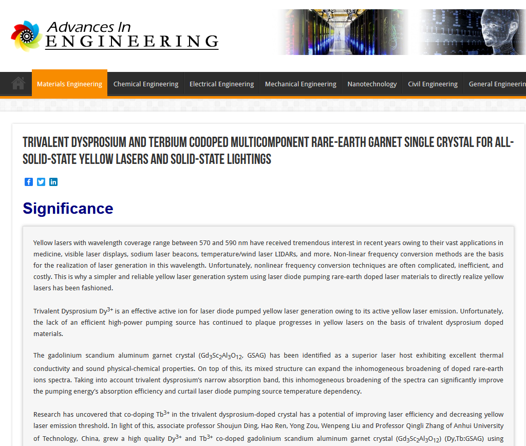 AIE报道链接:https://advanceseng.com/trivalent-dysprosium-terbium-codoped-multicomponent-rare-earth-garnet-single-crystal-solid-state-yellow-lasers/