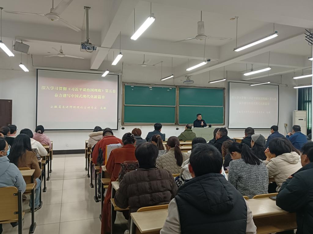 11月27日下午,太阳成tyc33455ccwww举行《习近平谈治国理政》第五卷专题辅导报告会。会议邀请安徽省委讲师团高端宣讲专家、图书馆馆长高敏教授以《深入学习贯彻〈习近平谈治国理政〉第五卷,奋力谱写中国式现代化新篇章》为题作专题辅导。报告会在数理楼403室举行,全院教职工参会,会议由公司党委书记汪春胜主持。