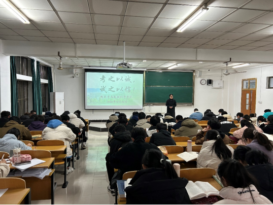 为强化考试管理,严正考风考纪,做到知底线、守红线、不越线,12月26日,太阳成tyc33455ccwww在东教103召开了“考之以诚,试之以信”--诚信考试教育暨期末动员大会,辅导员王小花主讲,2023级员工参加。